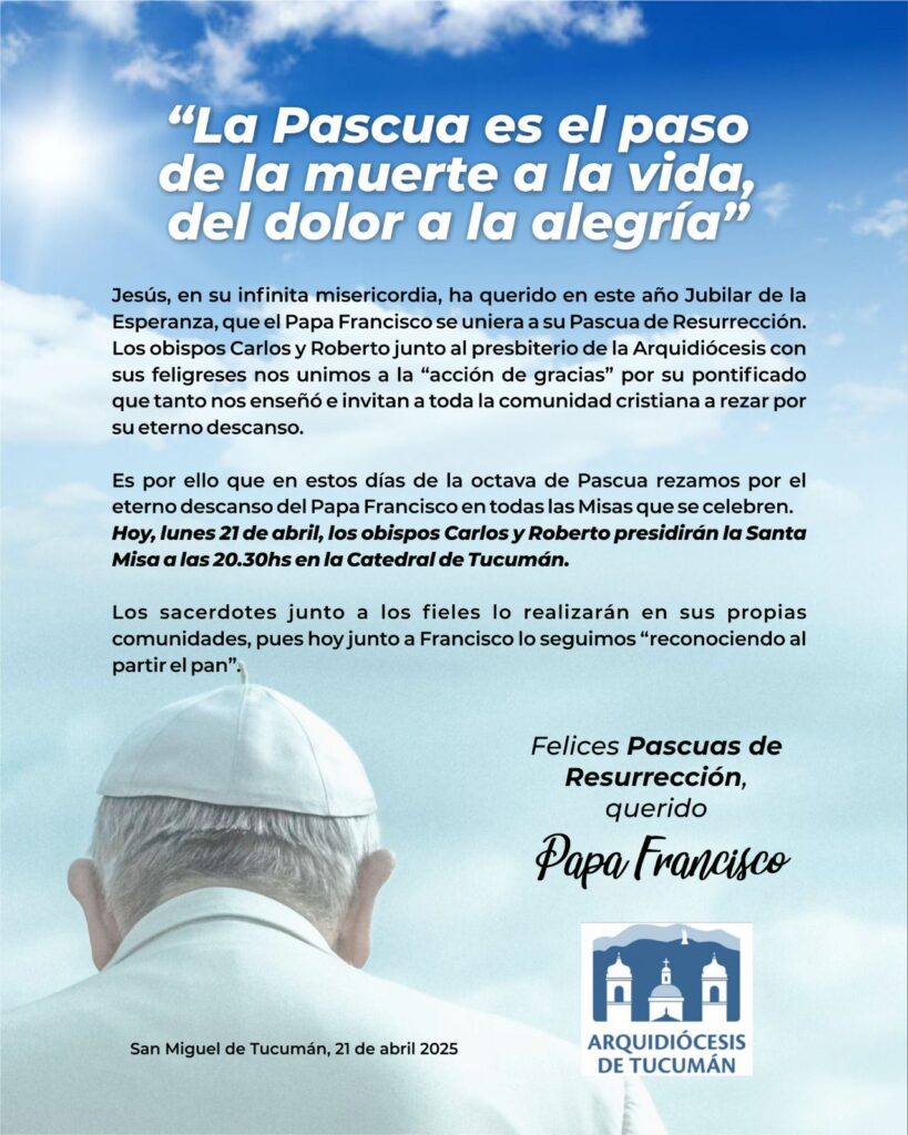 Los obispos de Tucumán, junto al presbiterio y los fieles de la Arquidiócesis, anunciaron este lunes que todas las misas de la semana estarán dedicadas a orar por el eterno descanso del Papa Francisco, fallecido en la madrugada del 21 de abril, a los 88 años.