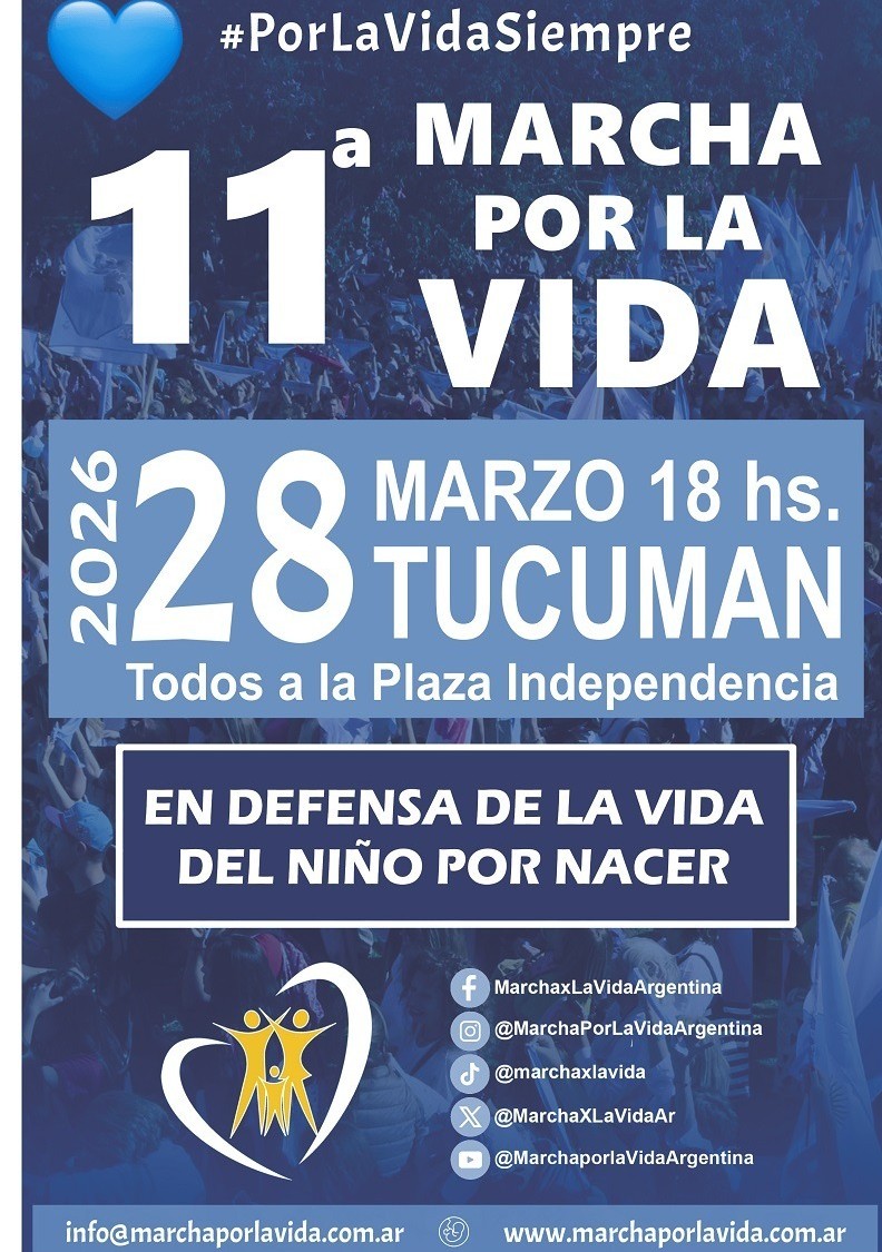 Organizaciones e Instituciones Provida, convocan a la 11ª Marcha por la Vida en Tucumán. Bajo el lema «Por la vida siempre», la marcha se llevará a cabo este sábado 28 de marzo, a las 18,30 horas en Plaza Independencia, para luego caminar hacia Casa Histórica, donde expresarán su compromiso con la vida.