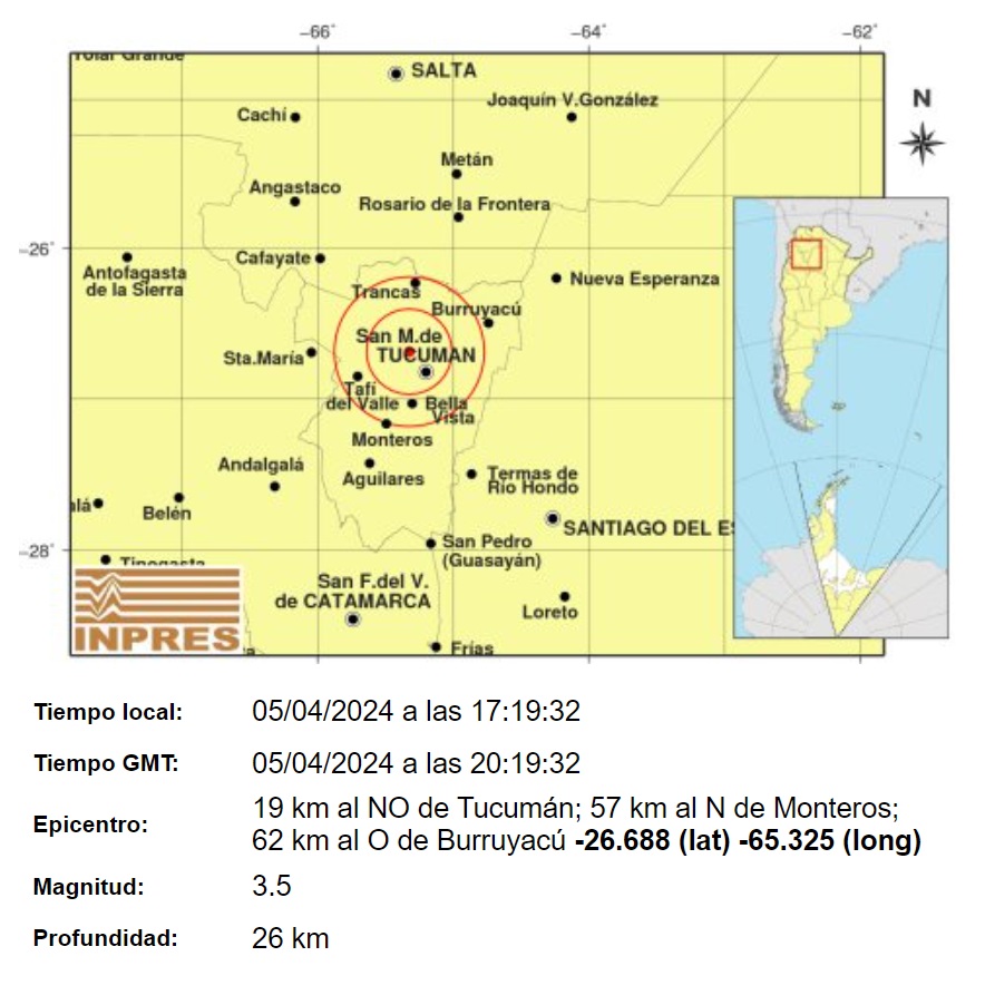 Según el INPRES, el fenómeno tuvo epicentro a solo 19 kilómetros al noroeste de la capital tucumana, una magnitud de 3,5 grados y una profundidad de 26 km.